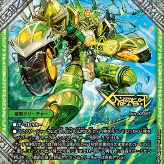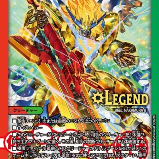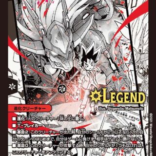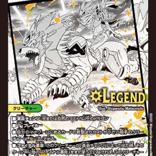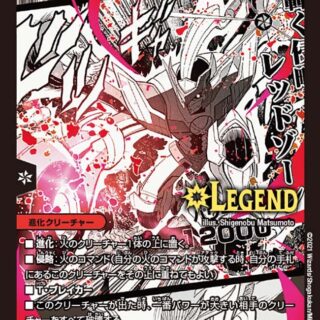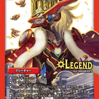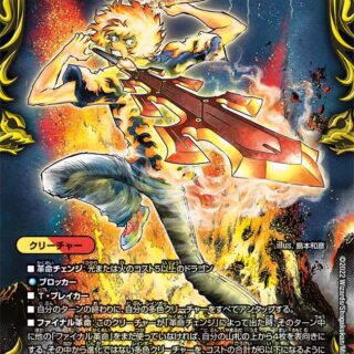 革命0トリガー:クリーチャーが自分を攻撃する時、自分のシールドが1つもなければ、このクリーチャーを手札から見せてもよい。そうしたら、自分の山札の上から1枚目を表向きにする。そのカードが火の進化ではないクリーチャーなら、バトルゾーンに出し、このクリーチャーをその上に置く。進化:自分の火のクリーチャー1体の上に置く。T・ブレイカーこのクリーチャーが出た時または攻撃する時、相手のクリーチャーを1体選んでもよい。その選んだクリーチャーとこのクリーチャーをバトルさせる。
