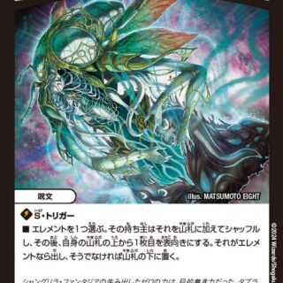 W・ブレイカー(このクリーチャーはシールドを2つブレイクする)このクリーチャーが出た時、自分の山札の上から3枚を表向きにする。その中から好きな数のドラゴン・クリーチャーを手札に加え、残りをタップしてマナゾーンに置く。自分のターンに一度、ドラゴン・クリーチャーを1体、自分のマナゾーンから召喚してもよい。(コストは支払う)