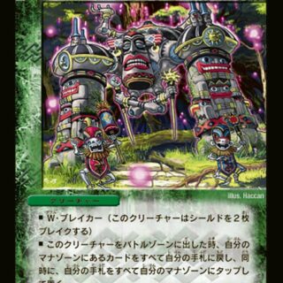 W・ブレイカー(このクリーチャーはシールドを2つブレイクする)このクリーチャーが攻撃する時、自分の山札の上から1枚目を表向きにする。そのカードが進化ではない無色クリーチャーなら出してもよい。