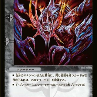 W・ブレイカーこのクリーチャーが出た時、または自分のターンのはじめに、自分のマナゾーンにあるカードを1枚、裏向きにしてもよい。自分のアンノウン・クリーチャーとゼニス・クリーチャーの召喚コストを3少なくする。ただし、コストは0以下にはならない。水晶武装4:自分のマナゾーンに裏向きのカードが4枚以上あれば、 自分のクリーチャーはバトルに負けた時以外、離れない。
