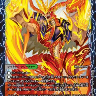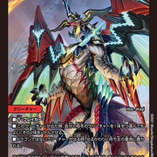 T・ブレイカーエターナル・Ω(このクリーチャーが離れる時、かわりに手札に戻す)このクリーチャーが召喚によって出た時、相手と3回ガチンコ・ジャッジする。クリーチャーを見せて自分が勝つたび、そのクリーチャーを山札の下に置くかわりに出す。呪文を見せて自分が勝つたび、その呪文を山札の下に置くかわりにコストを支払わずに唱える。自分のクリーチャーすべてに「スピードアタッカー」を与える。