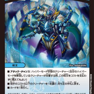 スレイヤー(このクリーチャーがバトルする時、バトルの後、相手クリーチャーを破壊する)このクリーチャーが破壊された時、自分の山札の上からカードを2枚表向きにする。そのうちの1枚をマナゾーンに置く。もう1枚がクリーチャーなら手札に加え、それ以外なら墓地に置く。ササゲール2(ディスペクターを召喚する時、コストを2少なくしてもよい。そうしたら、このクリーチャーを破壊する。そのディスペクターのコストは0以下にはならない)