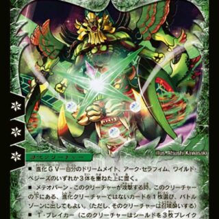 マナ進化GV:ドラゴン3体を自分のマナゾーンから選び、このクリーチャーをその上に重ねつつ出す。T・ブレイカーメテオバーン:このクリーチャーが攻撃する時、このクリーチャーの下にあるカードを3枚墓地に置いてもよい。そうしたら、自分の山札の上から3枚を表向きにする。その中から進化ではないドラゴンを好きな数出してもよい。残りを墓地に置く。