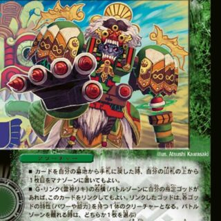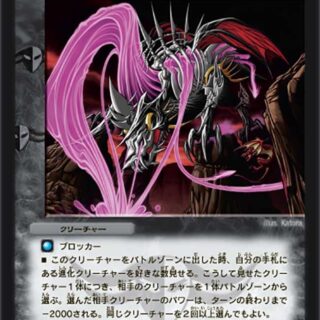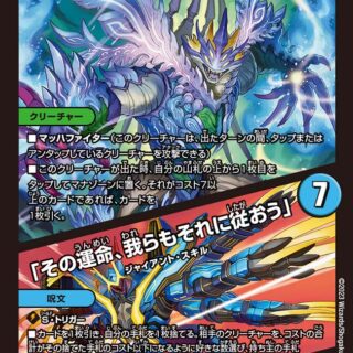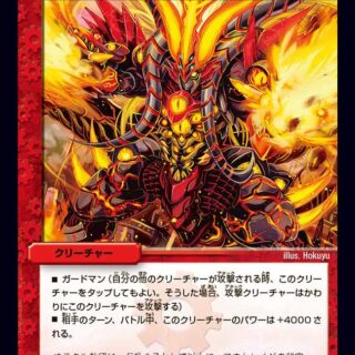 S・トリガースピードアタッカー(このクリーチャーは召喚酔いしない)W・ブレイカーこのクリーチャーが出た時、相手のクリーチャーを1体選んでもよい。その選んだクリーチャーとこのクリーチャーをバトルさせる。自分のターンの終わりに、自分のマナゾーンにカードが7枚以上なければ、このクリーチャーを破壊する。