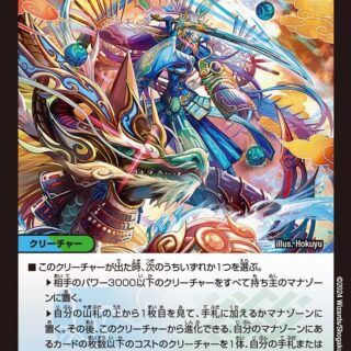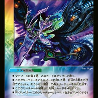 W・ブレイカーこのクリーチャーが出た時、自分の山札を見る。その中からコスト6以下の、クリーチャーではないカードを1枚、相手に見せてから手札に加えてもよい。自分の山札をシャッフルし、その後、そのカードを自分の手札からコストを支払わずに使う。