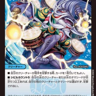 S・トリガー自分の山札の上から3枚を見る。そのうちの1枚をマナゾーンに置き、1枚を手札に加え、残りの1枚を墓地に置く。こうして墓地に置いたカード以下のコストを持つ相手のクリーチャーを1体破壊する。