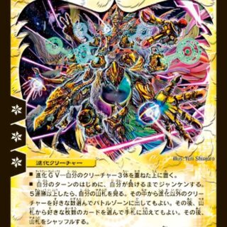 すべてのクリーチャーに「スピードアタッカー」と「ブロッカー」を与える。(「スピードアタッカー」を持つクリーチャーは召喚酔いしない。「ブロッカー」を持つクリーチャーをタップして、相手クリーチャーの攻撃先をそのクリーチャーに変更してもよい)このタマシードが破壊された時、相手のクリーチャーを1体選び、タップする。その後、このターン、自分のクリーチャー1体に「スピードアタッカー」を与え、バトル中のパワーを +1000000する。