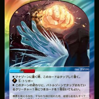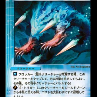 {STP} S・トリガー・プラス(このクリーチャーを自分のシールドゾーンから手札に加える時、コストを支払わずにすぐ召喚してもよい。それが相手のターンで、そのターン中に自分のシールドが2つ以上ブレイクされていれば、このクリーチャーに{x+}能力を与える){x+}このクリーチャーが出た時、相手のパワー12000以下のクリーチャーを1体選び、破壊する。このクリーチャーが出た時、次の自分のターンのはじめまで、自分が攻撃される時、相手は自身のパワーが一番小さいクリーチャーを1体選び、破壊する。