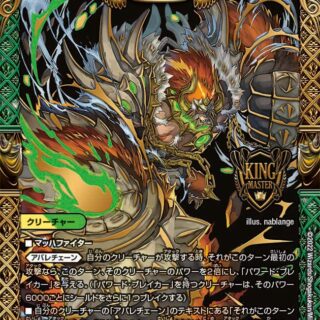 バズレンダ [cc03](このクリーチャーのコストを支払う時、追加で [cc03]を好きな回数支払ってもよい。このクリーチャーがバトルゾーンに出た時、その[OL]能力を1回と、追加で[cc03]支払った回数、使う){OL}自分の山札をシャッフルし、上から1枚目を表向きにする。それがクリーチャーなら、コストを支払わずに召喚してもよい。呪文なら、コストを支払わずに唱えてもよい。マッハファイターW・ブレイカー