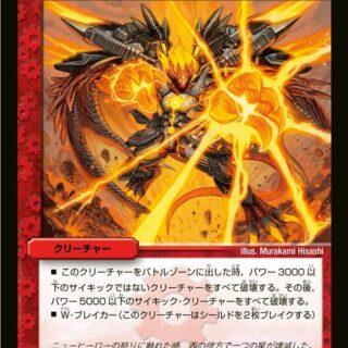 シビルカウント 3:自分の光のクリーチャーまたは光のタマシードが合計3つ以上あれば、自分のクリーチャーすべてに「ブロッカー」を与える。(「ブロッカー」を持つクリーチャーをタップして、相手クリーチャーの攻撃先をそのクリーチャーに変更してもよい)シビルカウント 3:自分の闇のクリーチャーまたは闇のタマシードが合計3つ以上あれば、自分のクリーチャーすべてに「スレイヤー」を与える。(「スレイヤー」を持つクリーチャーがバトルする時、バトルの後、相手クリーチャーを破壊する)自分のクリーチャーがバトル中に破壊された時、そのターンの終わりに、そのクリーチャーを墓地から出す。