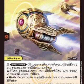 S・トリガー(このクリーチャーをシールドゾーンから手札に加える時、コストを支払わずにすぐ召喚してもよい)このクリーチャーが出た時、自分の山札の上から1枚目をマナゾーンに置く。このクリーチャーが破壊される時、墓地に置くかわりにマナゾーンに置く。