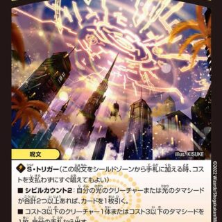 このタマシードが出た時、相手のコスト6以下のクリーチャーを1体選び、持ち主の手札に戻す。シールド・セイバー(自分のシールドがブレイクされる時、かわりにこのタマシードを破壊してもよい)