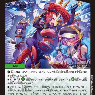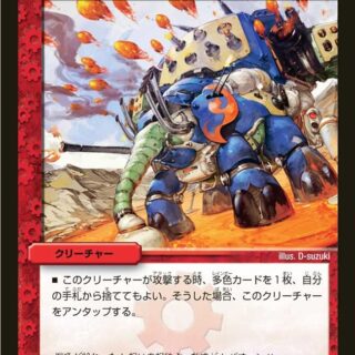 シビルカウント3:自分の火のクリーチャーまたは火のタマシードが合計3つ以上あれば、このクリーチャーは「スピードアタッカー」を得、バトル中パワーが+50000される。シビルカウント 5:自分の火のクリーチャーまたは火のタマシードが合計5つ以上あれば、このクリーチャーが攻撃する時、このクリーチャーをアンタップする。このクリーチャーが破壊された時、カードを1枚引く。その後、名前に《ボルシャック》とある進化ではないドラゴンを1体、自分の手札から出してもよい。