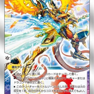 進化:水のドラゴン1体の上に置く。T・ブレイカーこのクリーチャーが出た時、自分の手札をすべて、好きな順序で山札の下に置く。その後、自分の山札の上から、呪文が3枚出るまで、カードを表向きにする。こうして表向きにした、呪文以外のカードをすべて山札に加えてシャッフルし、その後、その3枚の呪文をコストを支払わずに唱える。