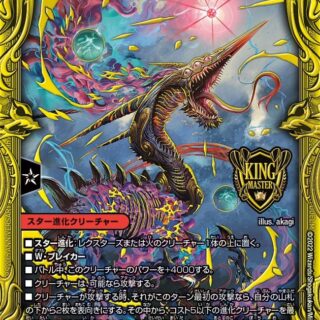 鬼タイム :自分と相手のシールドの数が合計6つ以下なら、このクリーチャーの召喚コストを5少なくする。スピードアタッカーT・ブレイカーこのクリーチャーは、召喚されたターン、バトルゾーンを離れない。このクリーチャーがバトルゾーンに出た時、クリーチャーをすべて破壊する。