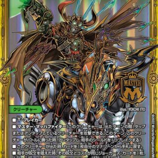 スピードアタッカーマスター・W・ブレイカー(このクリーチャーはシールドを2つブレイクする。このクリーチャーがバトルゾーンに出たターン、各ブレイクの前に、相手のクリーチャーを1体破壊する)バトルゾーンまたはマナゾーンに自分のジョーカーズが5枚以上あれば、このクリーチャーはブロックされず、攻撃の後、相手のシールドもクリーチャーもなければ、自分はゲームに勝つ。