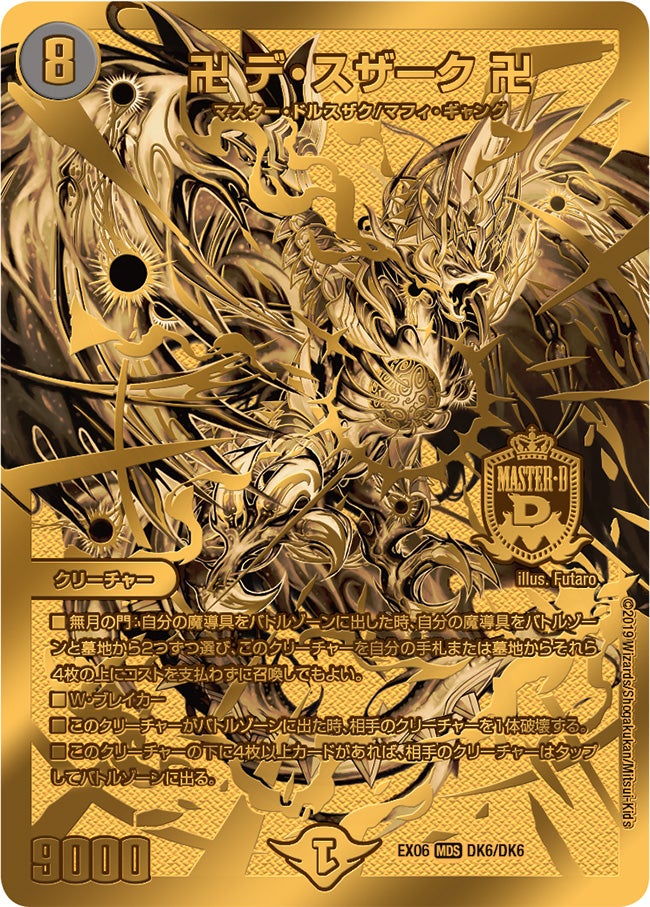 無月の門:自分の魔導具をバトルゾーンに出した時、自分の魔導具をバトルゾーンと墓地から2つずつ選び、このクリーチャーを自分の手札または墓地からそれら4枚の上にコストを支払わずに召喚してもよい。W・ブレイカーこのクリーチャーがバトルゾーンに出た時、相手のクリーチャーを1体破壊する。このクリーチャーの下に4枚以上カードがあれば、相手のクリーチャーはタップしてバトルゾーンに出る。
