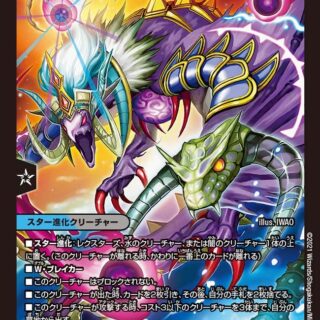 相手のクリーチャーが攻撃する時、自分の、光のタマシードを1枚含むアンタップしているタマシードを合計3枚、タップしてもよい。そうしたら、このカードを自分の手札から出す。S-MAX進化:自分がゲームに負ける時、かわりにこのクリーチャーを破壊するか、自分の手札から《サッヴァーク-MAX》を1枚捨てる。(このクリーチャーは進化元を必要としない。自分のS-MAX進化クリーチャーが2体以上あれば、そのうちの1体を残し、残りをすべて手札に戻す)ブロッカーW・ブレイカー自分のクリーチャーは、ブロック中破壊されない。