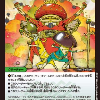 S・トリガー(このタマシードをシールドゾーンから手札に加える時、コストを支払わずにすぐ使ってもよい)シンカライズ:このタマシードがクリーチャーであるかのように、この上に進化クリーチャーを置いてもよい。このタマシードが出た時、相手は自身のクリーチャーを1体破壊する。