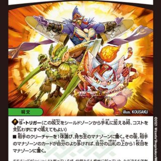 スター進化:レクスターズまたは自然のクリーチャー1体の上に置く。(このクリーチャーが離れる時、かわりに一番上のカードが離れる)W・ブレイカー(このクリーチャーはシールドを2つブレイクする)このクリーチャーが攻撃する時、バトルゾーンにある自分のタマシードを1枚、マナゾーンに置いてもよい。その後、そのタマシードよりコストが小さいタマシードを1枚、自分のマナゾーンから出してもよい。