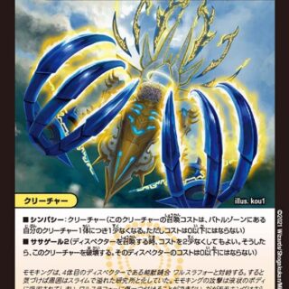 スター進化:レクスターズまたは闇のクリーチャー1体の上に置く。(このクリーチャーが離れる時、かわりに一番上のカードが離れる)W・ブレイカー(このクリーチャーはシールドを2つブレイクする)このクリーチャーが攻撃する時、自分のクリーチャー1体またはタマシードを1枚破壊してもよい。そうしたら、相手は自身のクリーチャーを1体選んで破壊する。