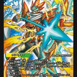 シンパシー:クリーチャー(このクリーチャーの召喚コストは、バトルゾーンにある自分のクリーチャー1体につき1少なくなる。ただしコストは0以下にはならない)スター進化:レクスターズまたは光のクリーチャー1体の上に置く。(このクリーチャーが離れる時、かわりに一番上のカードが離れる)T・ブレイカー自分のクリーチャーが攻撃する時、自分の山札の上から1枚目をシールド化してもよい。