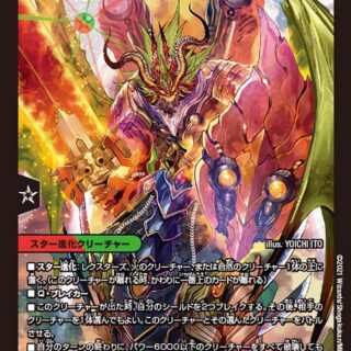 このクリーチャーの召喚コストを2少なくしてもよい。そうしたら、このターンの終わりに、このクリーチャーを破壊する。スター進化:レクスターズまたは闇のクリーチャー1体の上に置く。(このクリーチャーが離れる時、かわりに一番上のカードが離れる)W・ブレイカーこのクリーチャーが攻撃する時、自分の手札を好きな数捨ててもよい。その後、こうして捨てた手札の枚数に1を足した数、相手は自身のクリーチャーまたは手札を選び、墓地に置く。