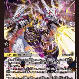 EXライフパワード・ブレイカー(このクリーチャーは、そのパワー6000ごとにシールドをさらに1つブレイクする)すべてのクリーチャーは、「スピードアタッカー」を得、ブロックできない。クリーチャーは可能なら攻撃する。クリーチャーの攻撃の終わりに、そのクリーチャーを破壊する。このクリーチャーの「EXライフ」シールドがなければ、このクリーチャーのパワーを+12000する。
