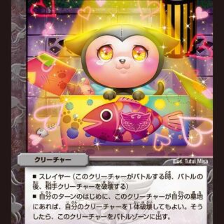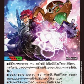 スピードアタッカー(このクリーチャーは召喚酔いしない)シンカパワー:このクリーチャーが進化する時、次のうちいずれか1つを選ぶ。▶相手のクリーチャーを2体まで選ぶ。次の自分のターンのはじめまで、それらのクリーチャーは攻撃もブロックもできない。▶相手のクリーチャーを2体まで選ぶ。次の相手のターン中、それらのクリーチャーは可能なら攻撃する。