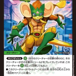 スレイヤー(このクリーチャーがバトルする時、バトルの後、相手クリーチャーを破壊する)シンカパワー:このクリーチャーが進化する時、次のうちいずれか1つを選ぶ。▶相手のクリーチャーを1体選ぶ。このターン、そのクリーチャーのパワーを-6000する。(パワー0以下のクリーチャーは破壊される)▶プレイヤーを1人選ぶ。そのプレイヤーは自身の墓地を山札に加えてシャッフルする。