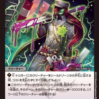 ブロッカー(このクリーチャーをタップして、相手クリーチャーの攻撃先をこのクリーチャーに変更してもよい)このクリーチャーが破壊された時、自分の墓地から手札に戻す。マナ武装 4:このクリーチャーが出た時、自分のマナゾーンに多色カードが4枚以上あれば、相手のクリーチャーを1体選び、持ち主の手札に戻す。