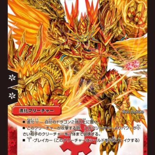 進化-自分のドラゴン1体の上に置く。このクリーチャーが攻撃する時、相手のマナゾーンからカードを最大2枚選んでもよい。相手はそれを自身の墓地に置く。T・ブレイカー(このクリーチャーはシールドを3枚ブレイクする)