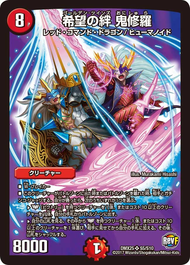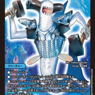W・ブレイカーこのクリーチャーがバトルゾーンに出た時またはバトルゾーンを離れた時、相手とガチンコ・ジャッジする。自分が勝ったら、次のうちいずれか1つを選ぶ。▼{Victory Icon}(ビクトリー)を持つクリーチャーを1体、またはコスト10以上のクリーチャーを1体、自分の手札からバトルゾーンに出す。▼自分の山札を見る。その中から{Victory Icon}(ビクトリー)を持つクリーチャー1体、またはコスト10以上のクリーチャーを1体選び、相手に見せてから自分の手札に加える。その後、山札をシャッフルする。