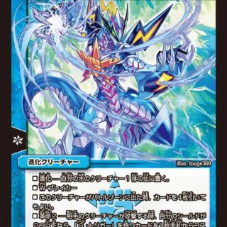 究極進化:進化クリーチャー1体の上に置く。侵略:光のコスト9の進化クリーチャー(自分の光のコスト9の進化クリーチャーが攻撃する時、自分の手札にあるこのクリーチャーをその上に重ねてもよい)T・ブレイカーこのクリーチャーが出た時、このターン、相手は呪文を唱えることができず、コストが9より小さいクリーチャーを召喚できない。