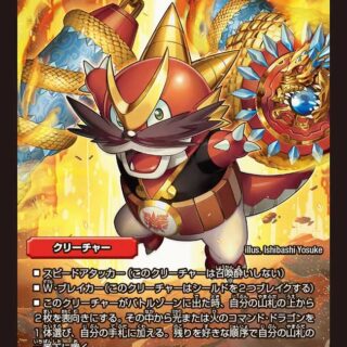 マナドライブ6(火):このクリーチャーがバトルゾーンに出た時、自分のマナゾーンのカードが6枚以上で火文明があれば、自分の山札の上から1枚目を表向きにする。それがコスト6以下の進化ではないクリーチャーならバトルゾーンに出す。それ以外なら山札の一番下に置く。(ゲーム開始時、GRクリーチャーは山札には含めず、自分の超GRに置き、バトルゾーン以外のゾーンに行った場合、超GRの一番下に戻す)