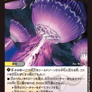 B・A・D 1(このクリーチャーを、コストを1少なくして召喚してもよい。そうしたら、このターンの終わりにこのクリーチャーを破壊する)このクリーチャーがバトルゾーンに出た時、自分の山札の上から3枚を見る。その中からビートジョッキーを1体バトルゾーンに出してもよい。残りを好きな順序で自分の山札の一番下に置く。このターンの終わりに、そのビートジョッキーを破壊する。