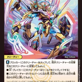 W・ブレイカーこのクリーチャーをバトルゾーンに出した時、バトルゾーンにある相手のクロスギア1枚か、相手のマナゾーンにあるカードを1枚選び、持ち主の墓地に置いてもよい。G・リンク:《龍神ヘヴィ》または《破壊神デス》の右横このクリーチャーは、リンクしている時「T・ブレイカー」を得る。このクリーチャー、《龍神ヘヴィ》、《破壊神デス》の3体がリンクしていて、《破壊神デス》が バトルゾーンを離れた時、このクリーチャーを《龍神ヘヴィ》とリンクさせてもよい。