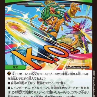 EXライフ(このクリーチャーを出す時、自分の山札の上から1枚目をシールド化する。このクリーチャーが離れる時、かわりにそのシールドを墓地に置く)W・ブレイカー(このクリーチャーはシールドを2つブレイクする)バトル中、このクリーチャーのパワーを+6000する。
