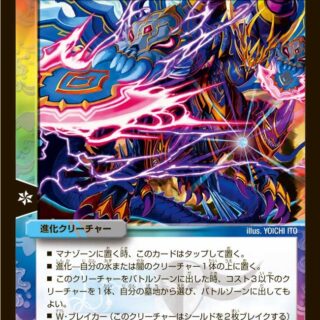 スーパー・S・トリガー(この呪文を自分のシールドゾーンから手札に加える時、コストを支払わずにすぐ唱えてもよい。その時自分のシールドが1つもなければ、この呪文にxB能力を与える)自分の山札の上から2枚をマナゾーンに置く。その後、カードを1枚、自分のマナゾーンから手札に戻す。xB自然の進化ではないクリーチャーを2体まで、自分のマナゾーンからバトルゾーンに出す。
