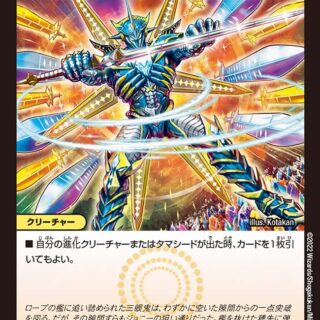 自分のクリーチャーを1体破壊してもよい。そうした場合、自分の山札を見る。その中からクリーチャーを1体選び、相手に見せてから手札に加えてもよい。その後、山札をシャッフルする。