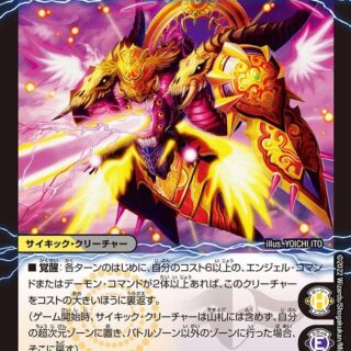 EXライフ(このクリーチャーを出す時、自分の山札の上から1枚目をシールド化する。このクリーチャーが離れる時、かわりにそのシールドを墓地に置く)W・ブレイカー(このクリーチャーはシールドを2つブレイクする)自分のターンの終わりに、このクリーチャーをアンタップする。