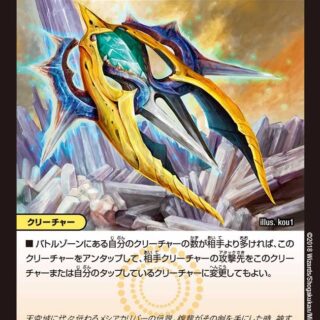 S・トリガー(この呪文をシールドゾーンから手札に加える時、コストを支払わずにすぐ唱えてもよい)相手のクリーチャーを1体選び、持ち主の手札に戻す。バトルゾーンに自分のパワー6000以上のクリーチャーがあれば、カードを1枚引く。