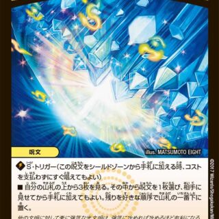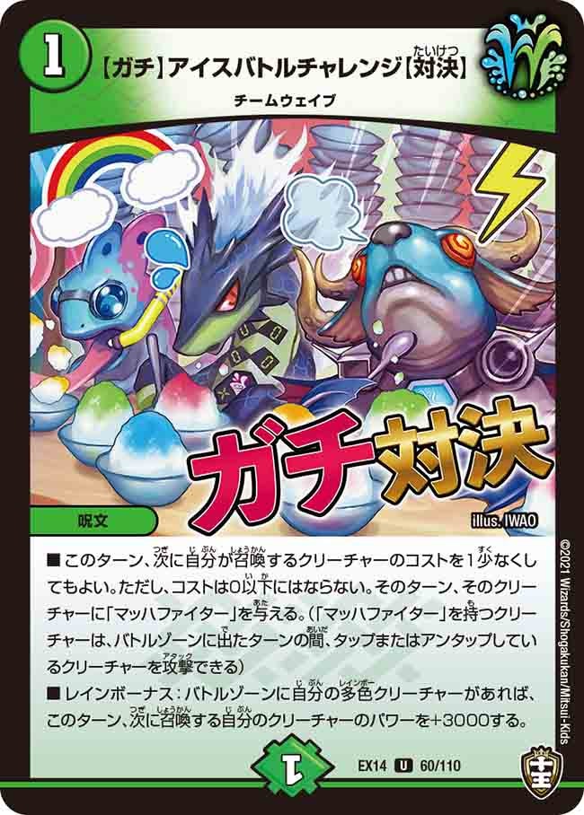 このターン、次に自分が召喚するクリーチャーのコストを1少なくしてもよい。ただし、コストは0以下にはならない。そのターン、そのクリーチャーに「マッハファイター」を与える。(「マッハファイター」を持つクリーチャーは、バトルゾーンに出たターンの間、タップまたはアンタップしているクリーチャーを攻撃できる)レインボーナス:バトルゾーンに自分の多色クリーチャーがあれば、このターン、次に召喚する自分のクリーチャーのパワーを+3000する。