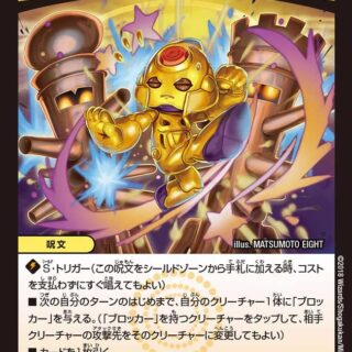 S・トリガー(このクリーチャーをシールドゾーンから手札に加える時、コストを支払わずにすぐ召喚してもよい)このクリーチャーがバトルゾーンに出た時、クリーチャーを1体選び、タップまたはアンタップする。