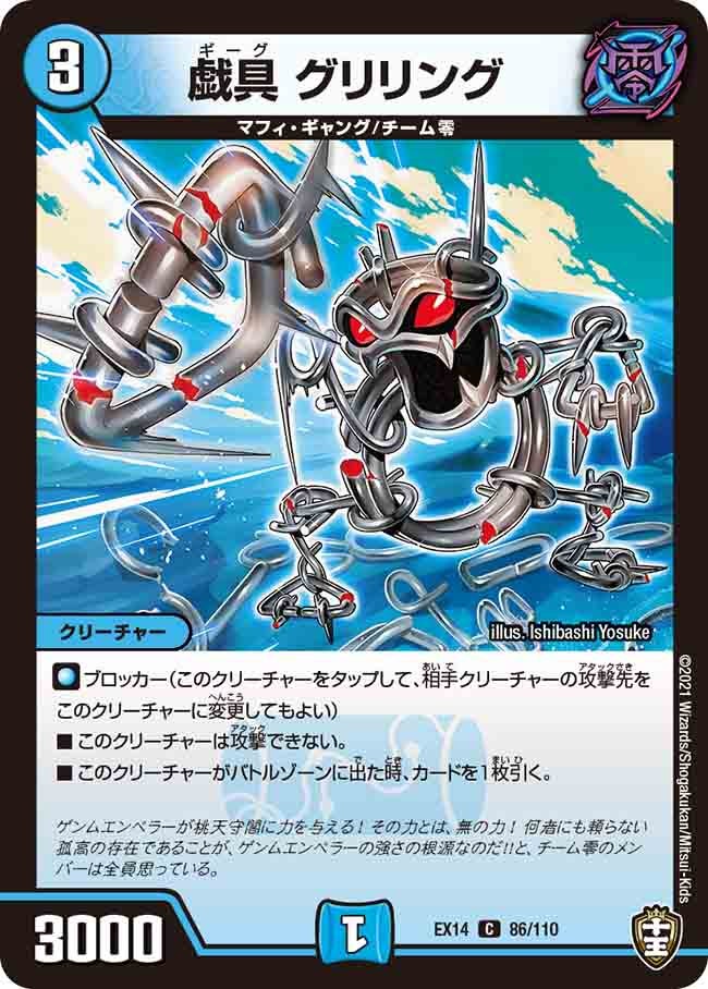 ブロッカー(このクリーチャーをタップして、相手クリーチャーの攻撃先をこのクリーチャーに変更してもよい)このクリーチャーは攻撃できない。このクリーチャーがバトルゾーンに出た時、カードを1枚引く。