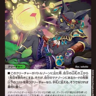 ブロッカー(このクリーチャーをタップして、相手クリーチャーの攻撃先をこのクリーチャーに変更してもよい)このクリーチャーは攻撃できない。このクリーチャーがバトルゾーンに出た時、自分の山札の上から1枚目を墓地に置く。