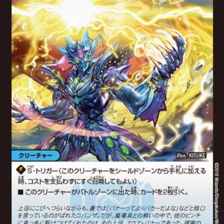 ブロッカー(このクリーチャーをタップして、相手クリーチャーの攻撃先をこのクリーチャーに変更してもよい)このクリーチャーがバトルゾーンに出た時、自分の山札の上から1枚目を裏向きのまま、新しいシールドとしてシールドゾーンに置く。このクリーチャーがバトルゾーンを離れた時、自分のシールドを1つ手札に加える。ただし、その「S・トリガー」は使えない。