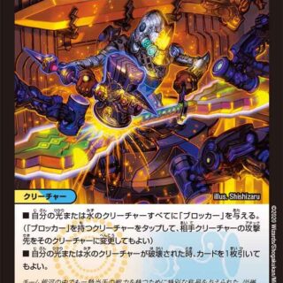 S・トリガー(このクリーチャーをシールドゾーンから手札に加える時、コストを支払わずにすぐ召喚してもよい)スレイヤー(このクリーチャーがバトルする時、バトルの後、相手クリーチャーを破壊する)このクリーチャーがバトルゾーンに出た時、相手のクリーチャーを1体選ぶ。次の自分のターンのはじめまで、そのクリーチャーは攻撃もブロックもできない。