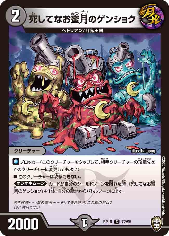 ブロッカー(このクリーチャーをタップして、相手クリーチャーの攻撃先をこのクリーチャーに変更してもよい)このクリーチャーは攻撃できない。オシオキムーン:カードが自分のシールドゾーンを離れた時、《死してなお蜜月のゲンショク》を1体、自分の墓地からバトルゾーンに出す。