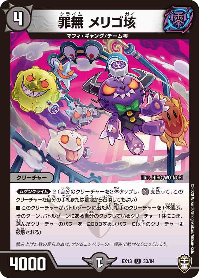 ムゲンクライム 2(自分のクリーチャーを2体タップし、 [dd02]支払って、このクリーチャーを自分の手札または墓地から召喚してもよい)このクリーチャーがバトルゾーンに出た時、相手のクリーチャーを1体選ぶ。そのターン、バトルゾーンにある自分のタップしているクリーチャー1体につき、選んだクリーチャーのパワーを -2000する。(パワー0以下のクリーチャーは破壊される)